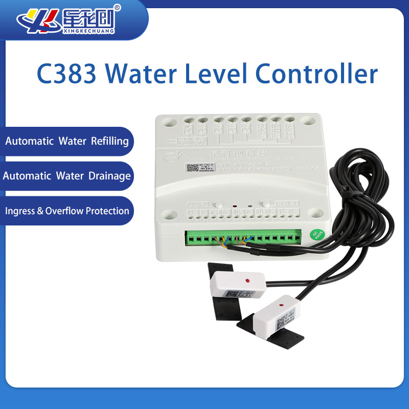 XKC-C383 intelligent non-contact liquid level controller and two non-contact liquid level detection heads realize the liquid level control function:When the liquid level in the container is too low, the low liquid level alarm signal from the low liquid level sensor triggers the C383 controller to close the relay to start the water pump to add liquid level. When the liquid level reaches a certain height, the high liquid level sensor sends out a signal to trigger the C383 controller to disconnect the relay automatically stop the water pump, so that the cycle works to realize the automatic replenishment and pumping of the container